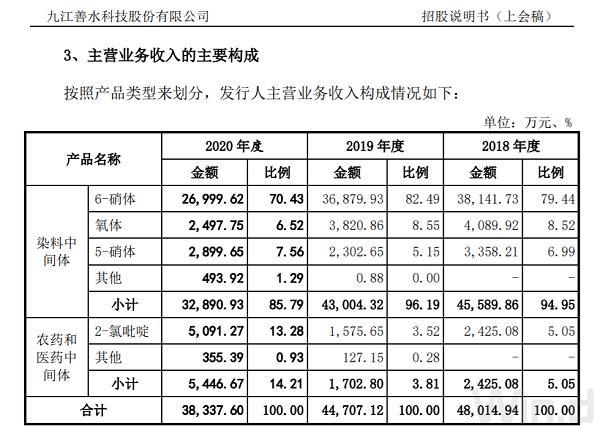 善水科技主要经营染料中间体、农药和医药中间体的研发、生产和销售业务,其中染料中间体包括6-硝体、氧体、5-硝体和邻氨基苯磺酸,农药和医药中间体包括2-氯吡啶等氯代吡啶系列产品。