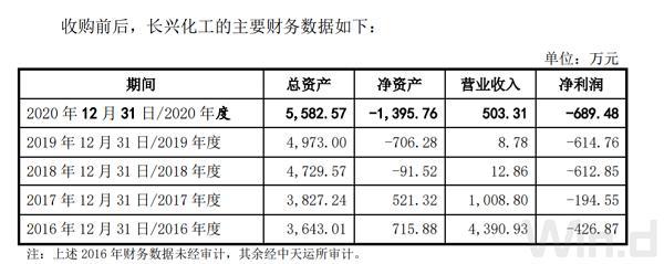 长兴化工的营收自收购以来逐年递减,其2016年的营收尚可达到4390.93万元,但2019年却只有8.78万元的营收,下滑99.8%。