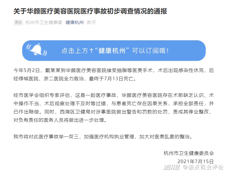 最新一起轰动案例是,33岁杭州女子网红小冉因抽脂感染医治无效去世,引发网友热议。官方通报称,根据专家评估,华颜医疗美容医院存在术前缺乏认识、术中操作不当、术后观察处理不及时等过错,与小冉死亡存在因果关系,承担全部责任。