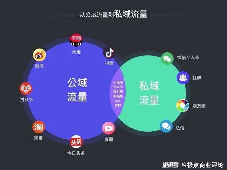 在最初,私域流量只是电商领域一个概念。相比淘宝、京东、抖音、今日头条等典型公域流量平台,私域流量要么是从公域导入,或是自主建立,沉淀在商家“流量池”里,如社群、朋友圈、微信号、微博、小程序等等。