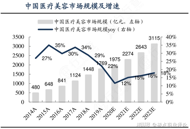 从大环境来看,多年监管整治、行业自律以后,医美行业整体向上变好。据德勤《中国医美市场趋势洞察报告》,2015-2019年,中国医美市场规模从648亿元一路攀升至1769亿元,年复合增长率达28.7%。根据预测,2023年中国医美市场规模将超过3115亿元。