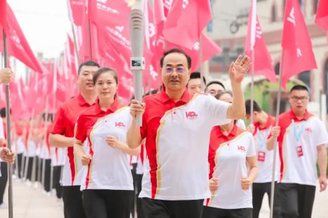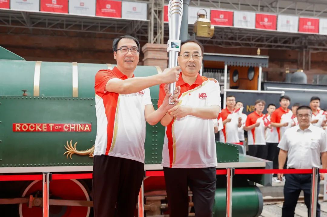 孙永才高举火炬,在全国劳动模范张雪松、张健,全国五一巾帼标兵孙斌斌、刘莉莉等护跑队员的跟随下,从主席台“1881年”起点出发,沿着中国中车成长发展的年代“轨迹”,奔向中国火箭号机车模型前的“2021年”交接点,把火炬传递给周军年。