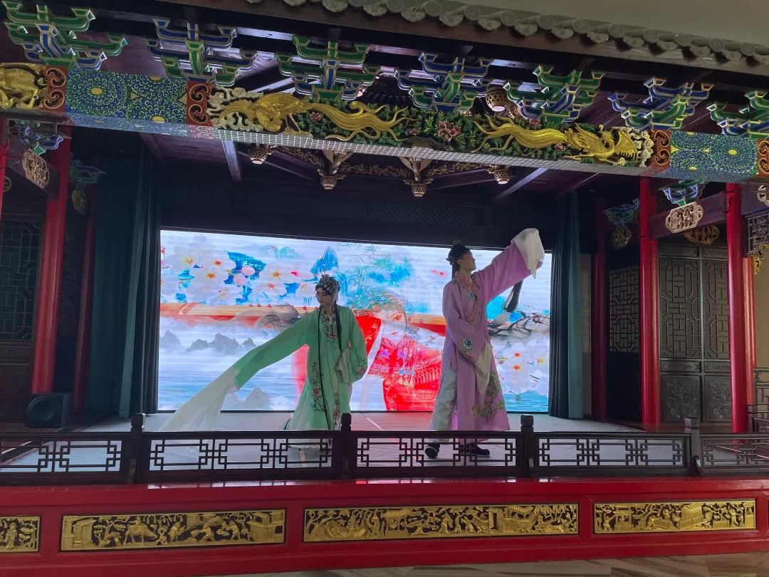 乘坐着游览车,实践团队对度假村内各个模块进行了参观。茶道展示、地方名人书画展览、戏曲演出、特色文化套房参观等体验,让实践团队成员对云澜湾文化产业园的文旅融合有了初步认识。