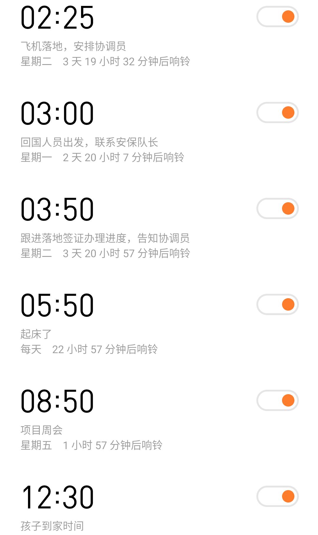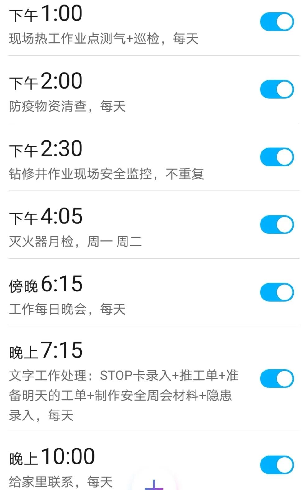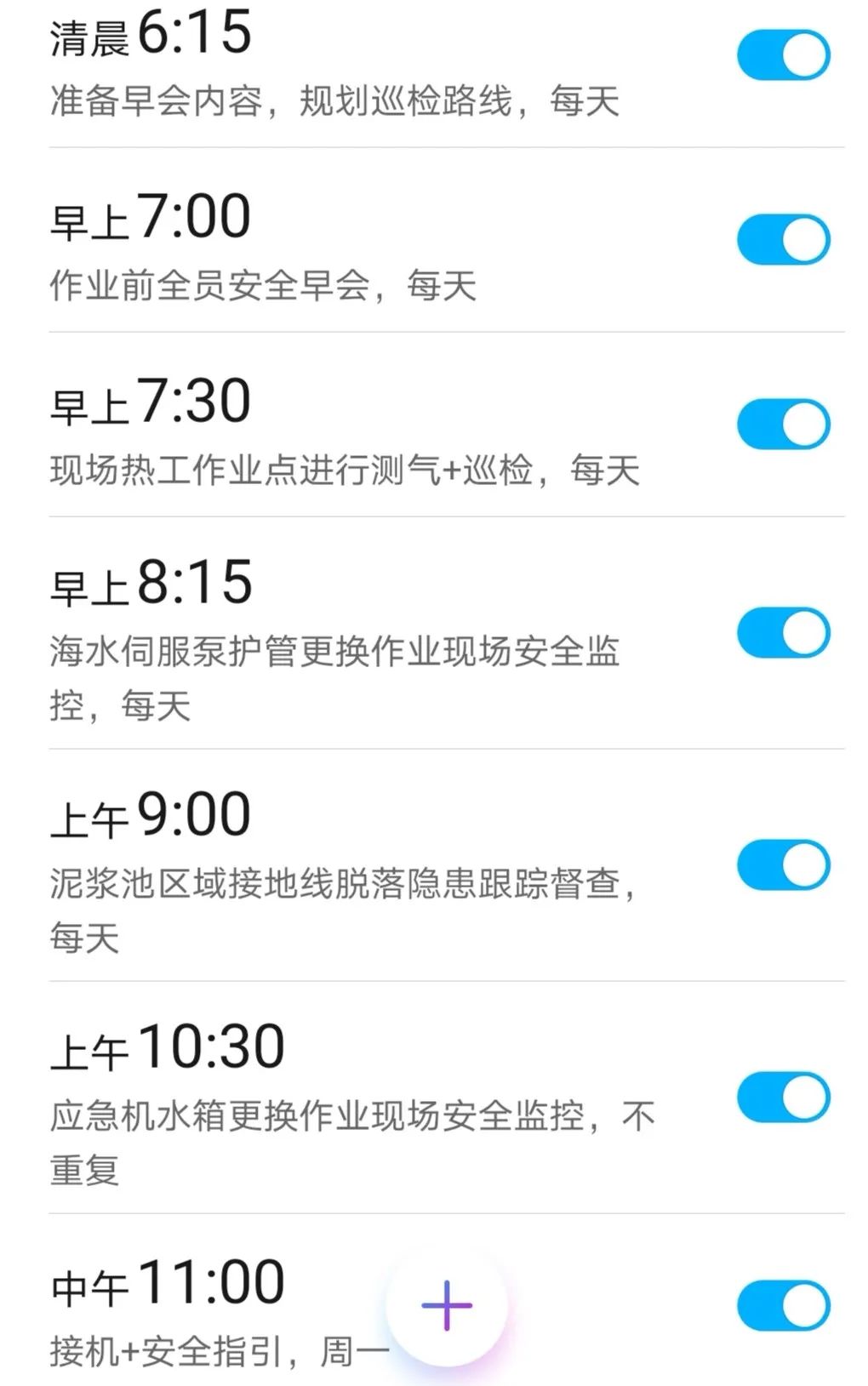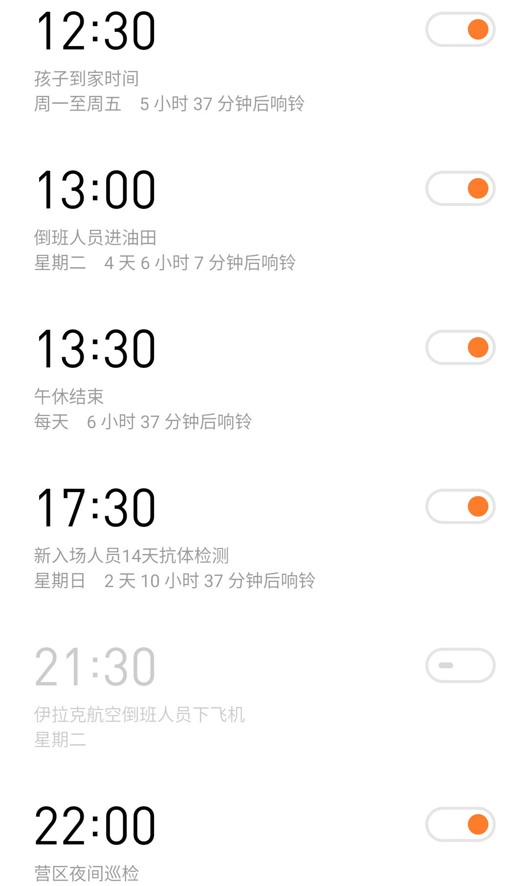 这一页满满的闹钟已经陪伴我快两年了,见证着我的成长。在繁忙的倒班生活中,我用这些闹钟提醒自己有条不紊地完成工作。凌晨2:55穿戴好劳保用品,拿着巡检仪、对讲机、测振线,对每一台机泵进行测温测振,保证机泵正常运行;4:55完成夜班的取样工作,5:30迎着清晨的第一缕阳光,认真巡检……