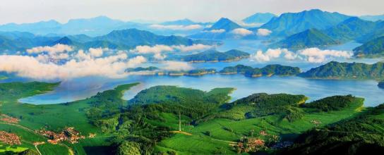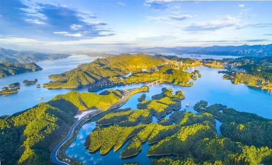 千岛湖,有“天下第一秀水”之称,它既有太湖的烟波浩渺,又有西湖的娟秀气韵。千余座翠岛跃然于澄碧的湖水之上,山林倒影清晰明亮,湛蓝的天空、茂密的森林、碧绿的湖水,色彩自然而然地过渡,如一幅水墨丹青画卷徐徐展开。从山脚下可乘缆车上山,站在山顶的观景台,亲身体会“青山绿水金腰带”的意境。月光岛,是千岛湖最具浪漫气息的地方,把爱锁在这座小岛上,为爱情许下美好的祝愿。