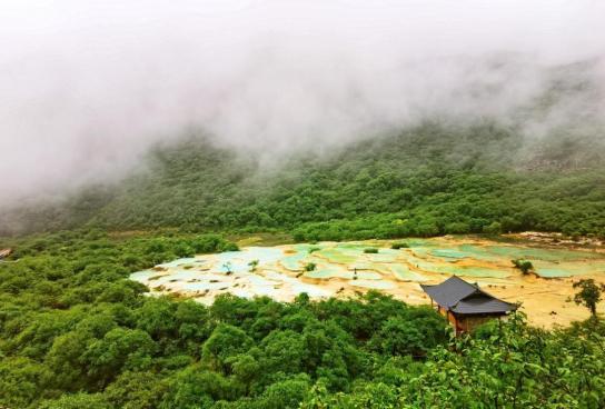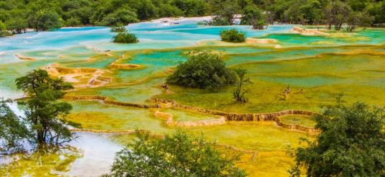 黄龙位于阿坝藏族羌族自治州松潘县境内,是中国唯一保护完好的高原湿地。沟中有许多彩池,随着周围景色变化和阳光照射角度变化,变幻出五彩的颜色,被誉为“人间瑶池”。黄龙以彩池、雪山、峡谷、森林“四绝”著称于世,再加上滩流、古寺、民俗称为“七绝”。693个钙池梯田式的排列有序,水中色彩斑斓,呈现出缤纷夺目的光彩,在高原之上熠熠生辉。