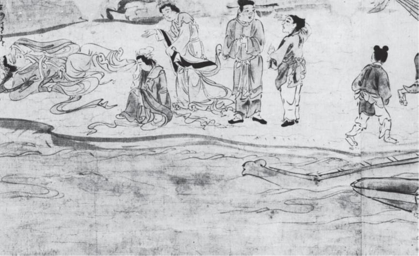 当善妙赶往港口与义湘告别时,她的袖子已经遮住了半张脸,深蹙双眉,显然正在哀声痛哭。为了衬托善妙的富家小姐身份,画师们还为她设置了三名随行女子,一位捧着准备送给义湘的宝箱,一个在陪她哭泣,还有一个指着义湘离开的方向。