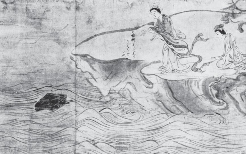 义湘绘绘卷 三/ 图 D/ 善妙投海/ 局部/ 纸本设色/ 高 31.7 厘米/ 国宝/ 京都高山寺藏《宋高僧传》对这段情节的描绘依然非常简短: