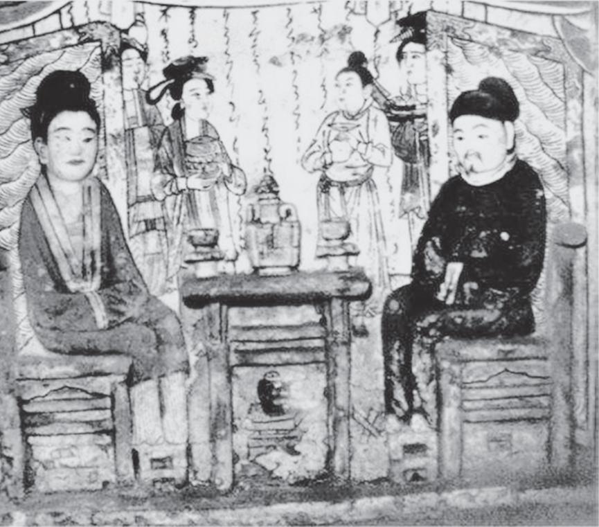 而《义湘绘》中善妙的服饰却大不相同,反而和宋代绘画中的女神形象比较贴近。山西金代岩山寺壁画中的鬼子母便可作为参考。鬼子母穿有云肩,身披璎珞,长袖上襦与善妙及其随从的样式相同,而善妙的侍女则与鬼子母的侍女的衣着相仿。与岩山寺壁画中的女性形象对比可见,善妙具有一种半神的身份。