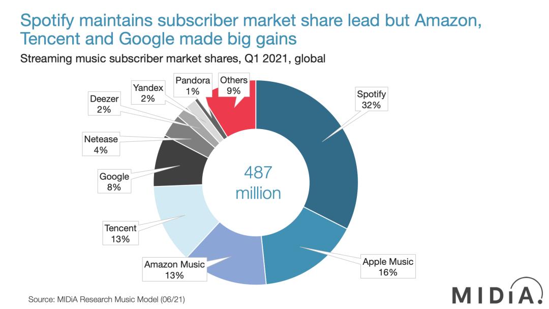 MiDIA:MiDIA发布报告称, 2021年第一季度全球音乐流媒体付费订阅用户总量是4.67亿。其中,Spotify付费用户量最高,约1.5亿,占市场份额32%,Apple Music付费用户量约7400万,占16%,腾讯音乐和亚马逊音乐的付费用户量超过6000万,各占13%。该报告称,2020年,付费用户量增长最快的是谷歌(YouTube Music),付费用户量增长了60%,其次是腾讯音乐,增长了40%。另外,付费用户量达到1800万的网易云音乐,仅次于谷歌。