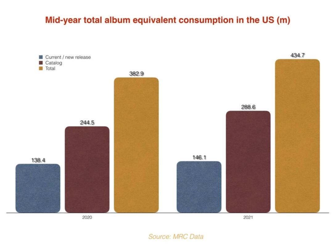 MRC Data:用户越来越喜欢听老歌?据MRC Data的数据监测,2021年上半年,在美国市场上,老歌的播放量占总播放量66.4%,比去年同期的63.9%,略有增长。