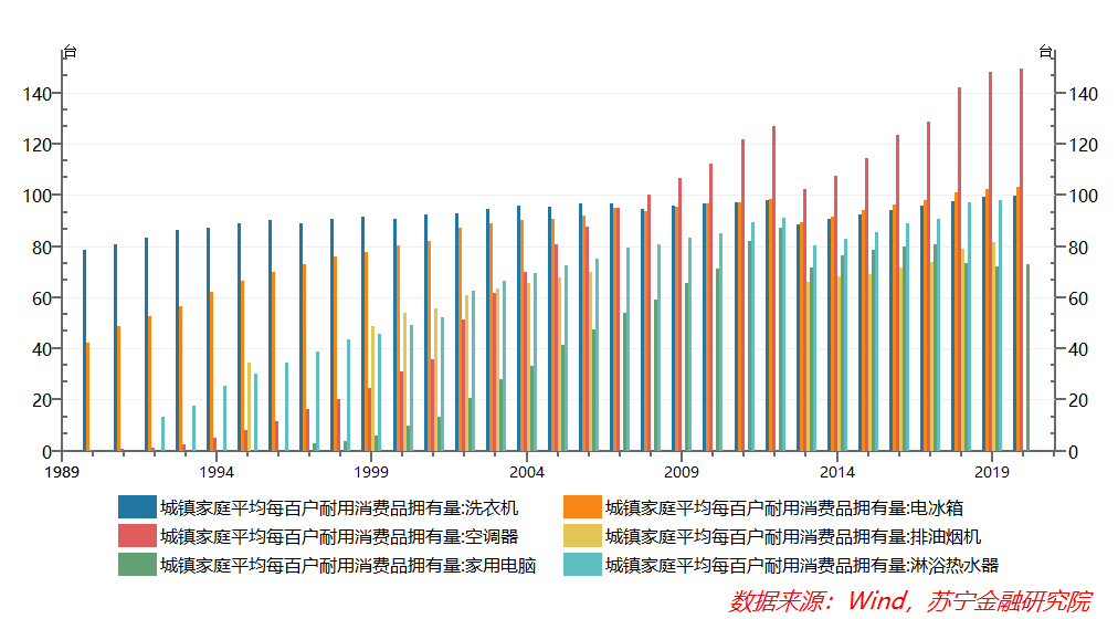 改革开放至今,伴随着国民经济的起飞,我国家居产业得到了迅猛的发展:从“老三件”到“新三件”的交替,从旧电器进口、散件组装到自主研发与规模化生产,从“引进来”到“走出去”,从少数家庭“独享”到千家万户普及,极大地满足了国人的物质需求,提高了老百姓的生活品质。国家统计局数据显示,2020年我国城镇冰箱、空调的百户保有量均超过100台(见下图)。