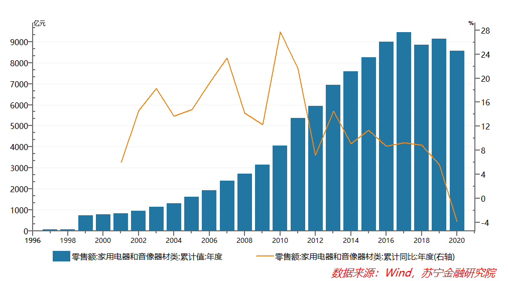 然而近几年,由于我国居民家电消费渐趋饱和,行业增长日益乏力(见下图)。根据欧睿国际的预测,2021~2024年,我国冰箱冰柜、空气处理器、衣物护理类三大家电产品销售额的复合年均增速将分别为3.56%、6.58%和9.49%,均显著低于2010~2020年的复合年均增速(分别为4.47%、8.92%和9.77%)。这便预示着,未来行业的发展势必要从“量”的扩张转向“质”的提升。