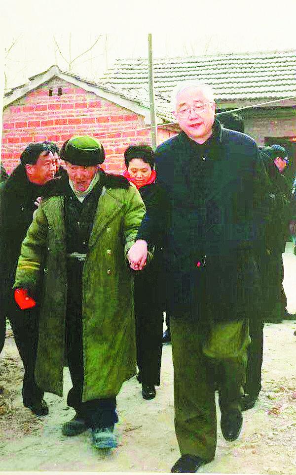 ○时任安徽省政协副主席的李宏塔(前右)在安徽阜阳市颍东区插花镇慰问困难群众(2011 年 1 月 14 日摄)。 新华社 发