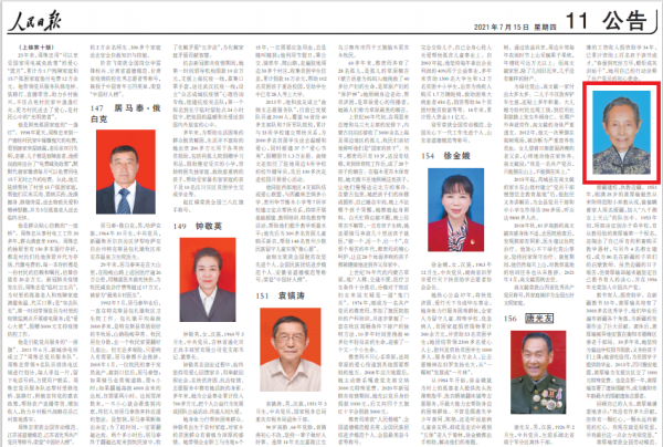 中国雁峰7月17日讯(通讯员 邓璐佳)7月15日,人民日报对“第八届全国道德模范候选人事迹”进行公示,雁峰区老干部服务中心离休干部黄厚瑜成功入选第八届全国道德模范候选人暨全国助人为乐模范候选人名单,其事迹在人民日报第11版刊登。