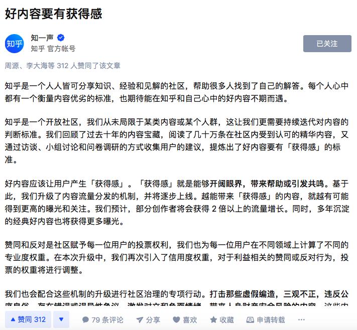 十天之后,知乎发布公告,公布结构性调整细则:升级社区内容标准,将获得感作为衡量社区内容和分发机制的统一标准,越是符合“能够开阔眼界,带来帮助或引发共鸣”这三大获得感标准的内容,约能得到更高的曝光和关注,进而提升收益。