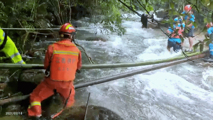 大雨骤降,突发山洪,深山峡谷中90名驴友被困,救援人员砍竹子,搭竹桥,跋山涉水6小时,将所有被困人员成功转移到安全地带。