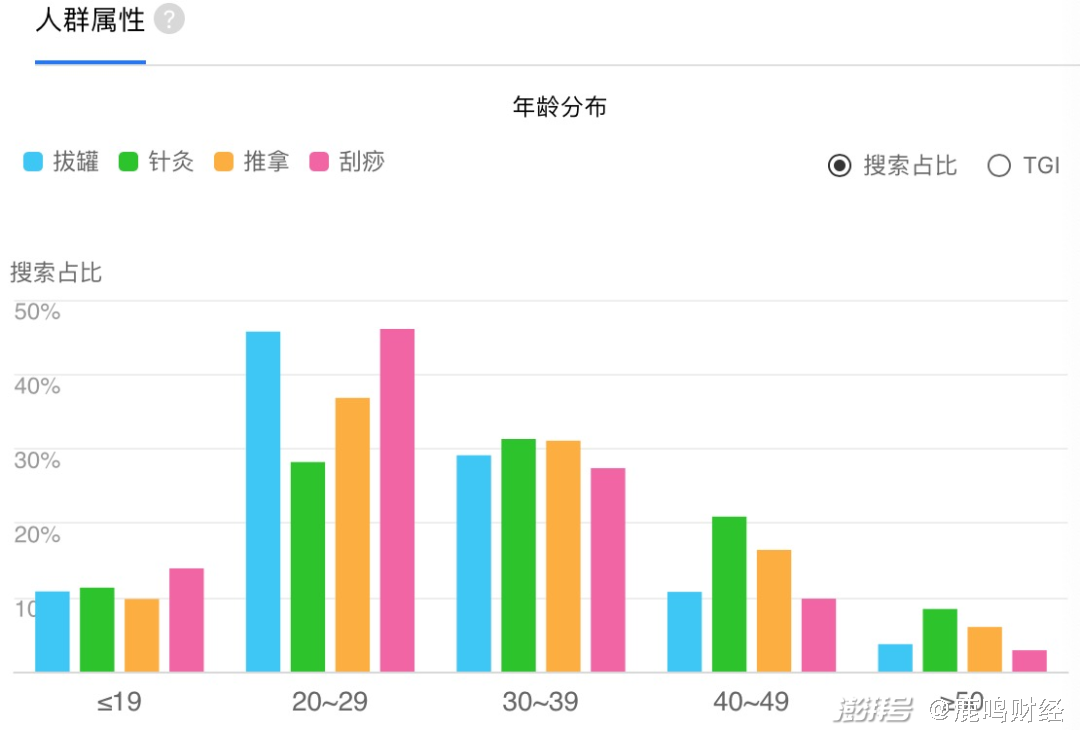 据百度指数显示,中医药疗愈分支外治疗法项目仍以中、青年群体为主,其中20-29岁的群体对该项目的关注度最高,更愿意为中医疗愈付出时间和金钱成本。