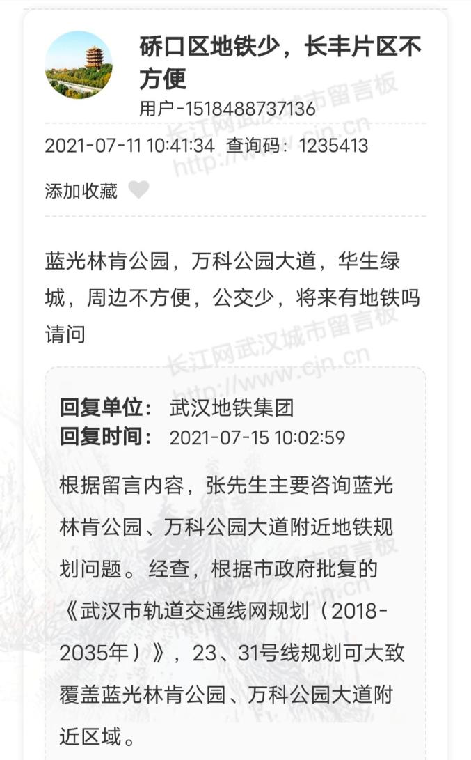 武汉地铁集团:根据市政府批复的《武汉市轨道交通线网规划(2018-2035年)》,23、31号线规划可大致覆盖蓝光林肯公园、万科公园大道附近区域。