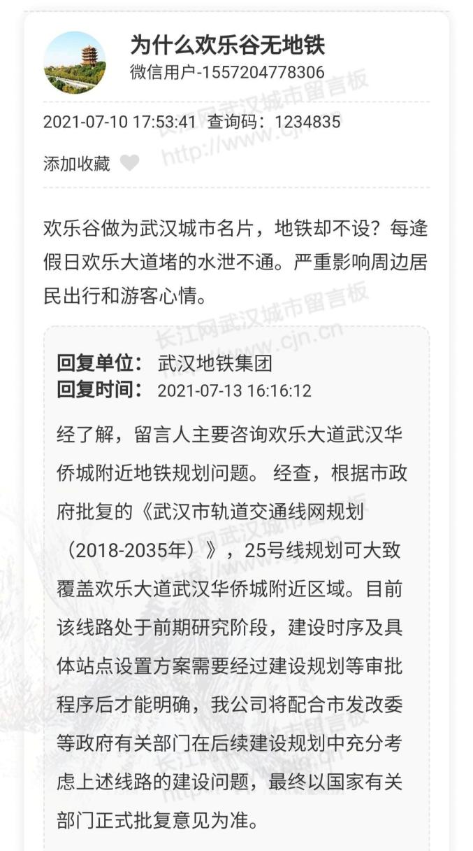 武汉地铁集团:根据市政府批复的《武汉市轨道交通线网规划(2018-2035年)》,25号线规划可大致覆盖欢乐大道武汉华侨城附近区域。