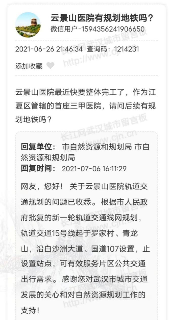 网友:云景山医院最近快要整体完工了,作为江夏区管辖的首座三甲医院,请问后续有规划地铁吗?