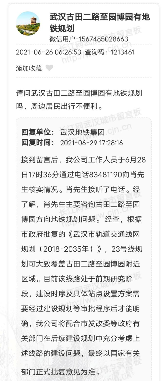 武汉地铁集团:根据市政府批复的《武汉市轨道交通线网规划(2018-2035年)》,23号线规划可大致覆盖古田二路至园博园附近区域。