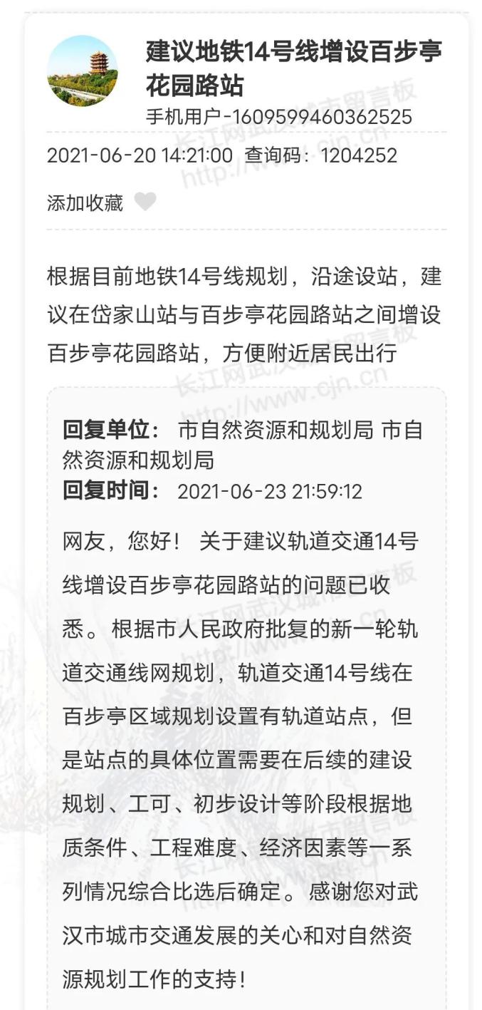 市自然资源和规划局: 根据市人民政府批复的新一轮轨道交通线网规划,轨道交通14号线在百步亭区域规划设置有轨道站点。