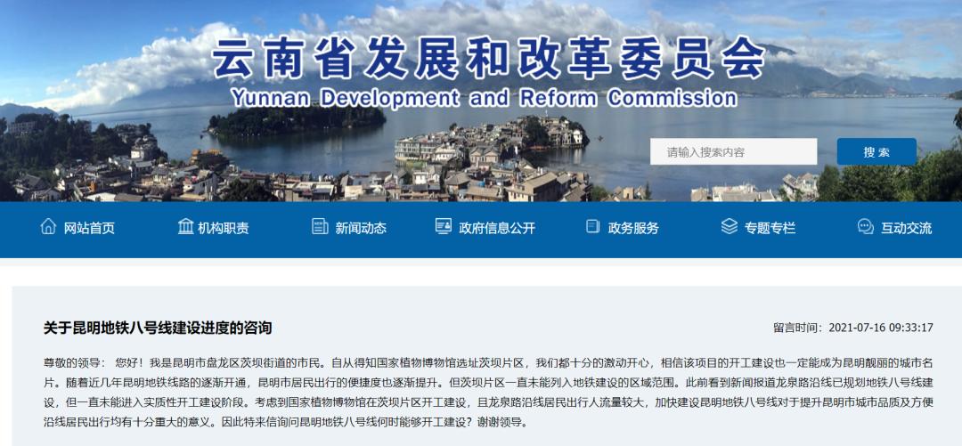 7月16日,有昆明市民向云南省发改委咨询:“随着近几年昆明地铁线路的逐渐开通,昆明市民出行的便捷度也逐渐提升。但茨坝片区一直未能列入地铁建设的区域范围。此前看到新闻报道龙泉路沿线已规划地铁八号线建设,但一直未能进入实质性开工建设阶段。昆明地铁八号线何时能够开工建设?”