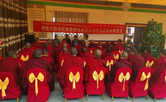 县委统战部扎实开展“四史”宣传教育进寺院活动,推动宗教界党史学习教育走深、走心、走实。叶格乡派驻工作组赴各寺院组织僧侣集中观看建党100周年大会直播,并进行了心得交流活动;曲麻河乡在各寺院开展“中国共产党对中华民族的历史贡献”为专题的活动,教职人员纷纷表示:没有共产党,就没有新中国,更没有广大百姓的幸福生活,我们会努力做到政治上靠得住,宗教上有造诣,品德上能服众,关键时刻起作用的僧尼;巴干乡在“七一”期间组织人员赴寺院开展党史学习进寺院活动,引导教职人员依法依规管理宗教事务,继承和弘扬历代高僧大德爱国爱教、尊规守法、弃恶扬善、崇尚和谐、祈求和平的优良传统,自觉维护祖国统一、民族团结、社会和谐,永做感党恩、听党话、跟党走,讲文明爱生活的好僧侣。