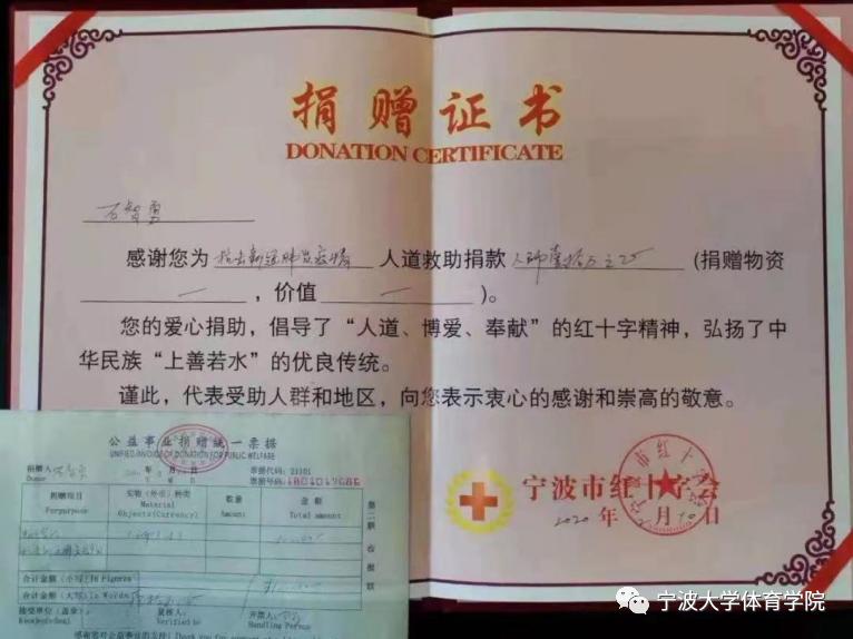 在运动成绩上他不断突破自我、创造奇迹,在学习上他认真努力、一丝不苟,他同样热衷于公益事业,2020年2月10日,他向宁波市红十字会为宁波抗击新冠肺炎疫情人道救助捐款人民币十万元,希望通过红十字会购买医疗防护用品给一线医务工作者。