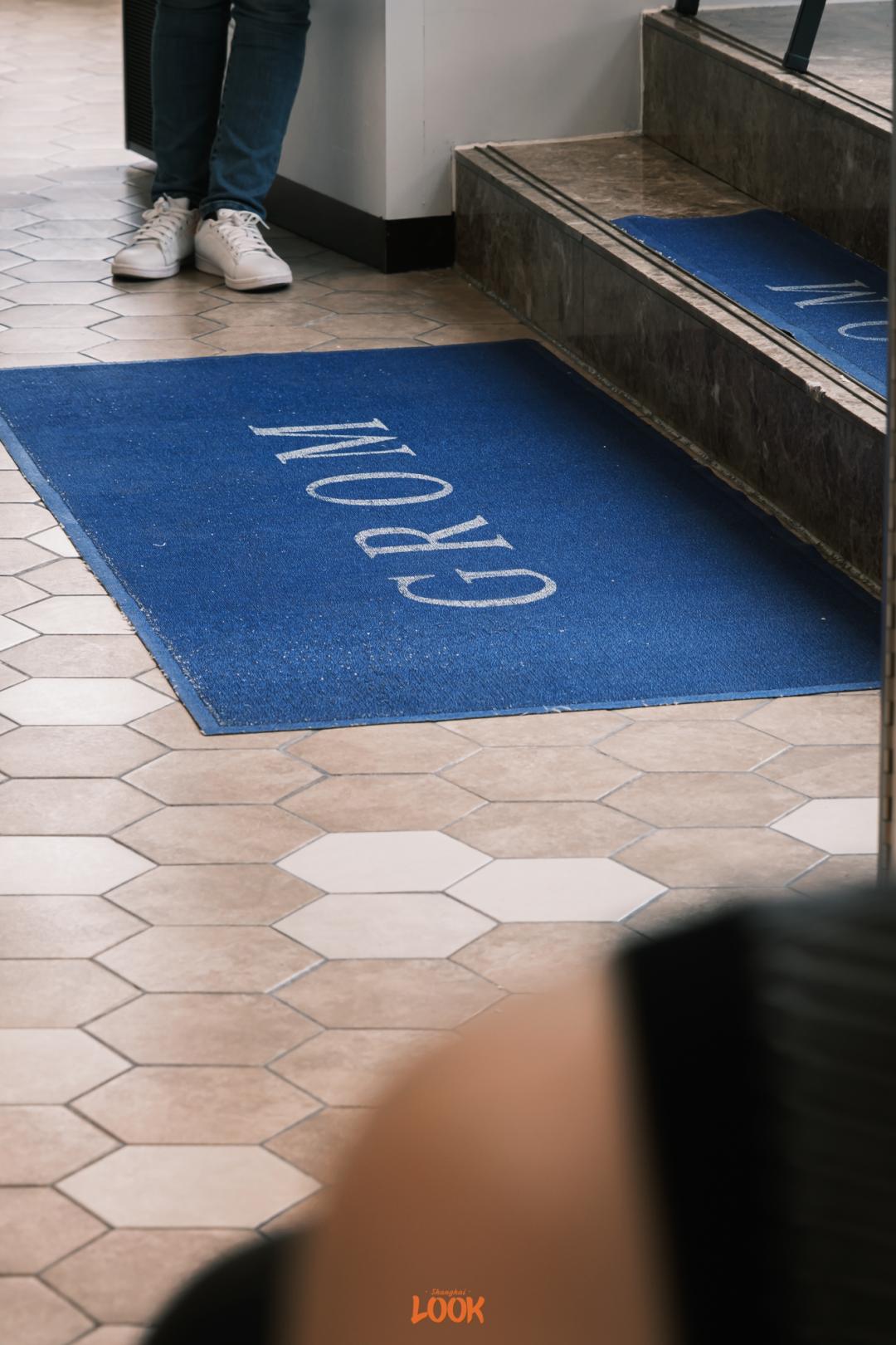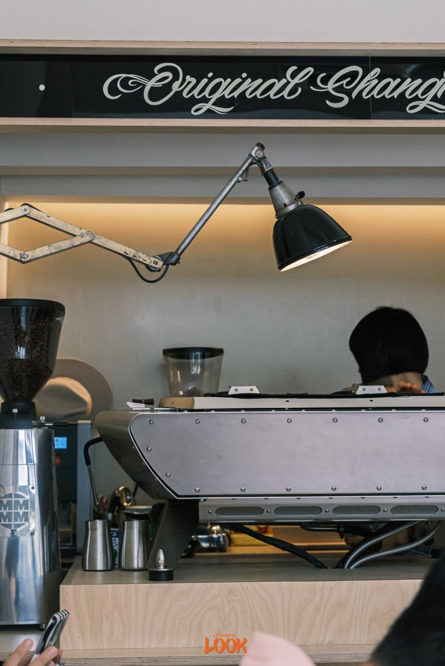 / 店门玻璃上细密铺画着灰褐色的格纹/ 金属质感的咖啡吧台格调十足