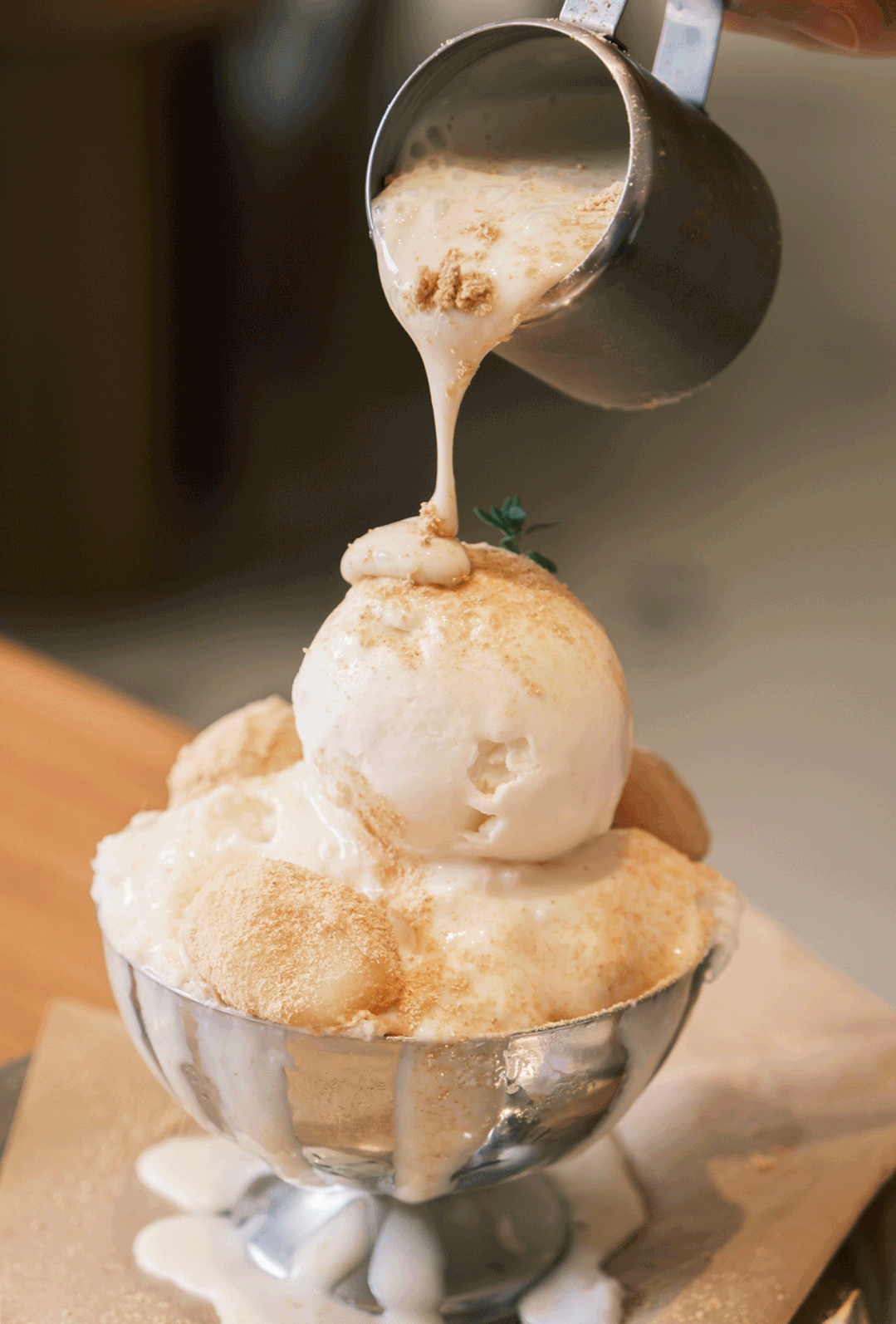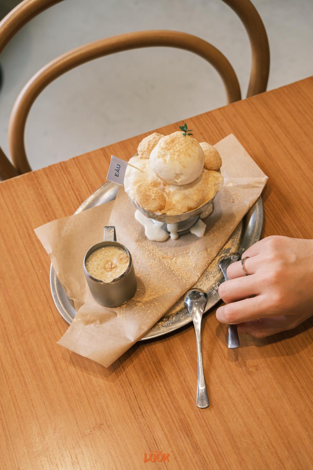 EÁU 的刨冰约莫三种口味,豆乳是务必尝一下的。绵软的雪冰顶着一颗硕大的香草冰淇淋球,糯米圆子是现蒸的,缀上后又洋洋洒洒扑上了喷香的黄豆粉。