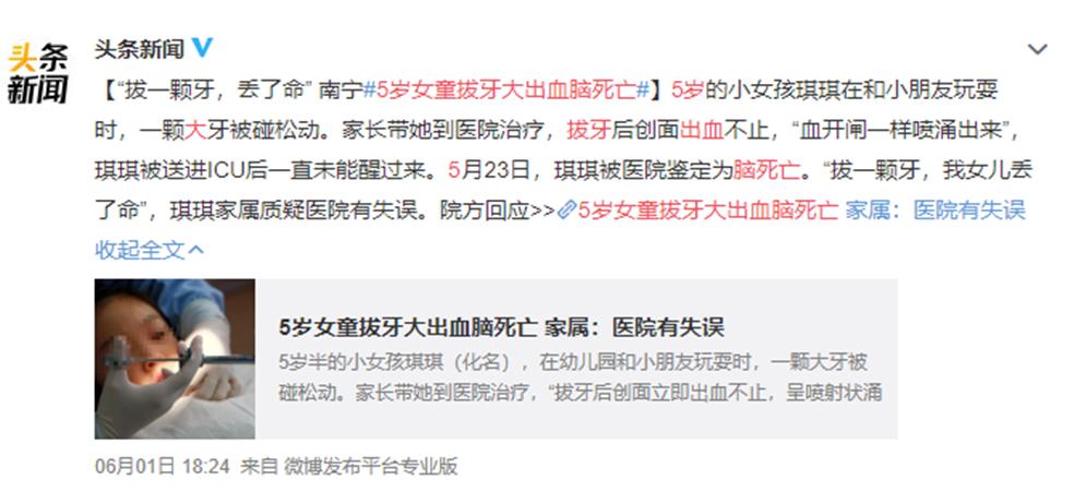 5岁女童拔牙后丧生!今年5月份,广西南宁市一名5岁半的女孩,一颗大牙因碰撞出现松动。于是家长就带她到医院治疗,没想到拔牙后流血不止,被送进ICU病房,最终被鉴定为脑死亡,不幸离开了人世……