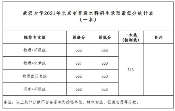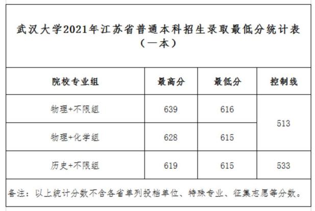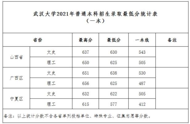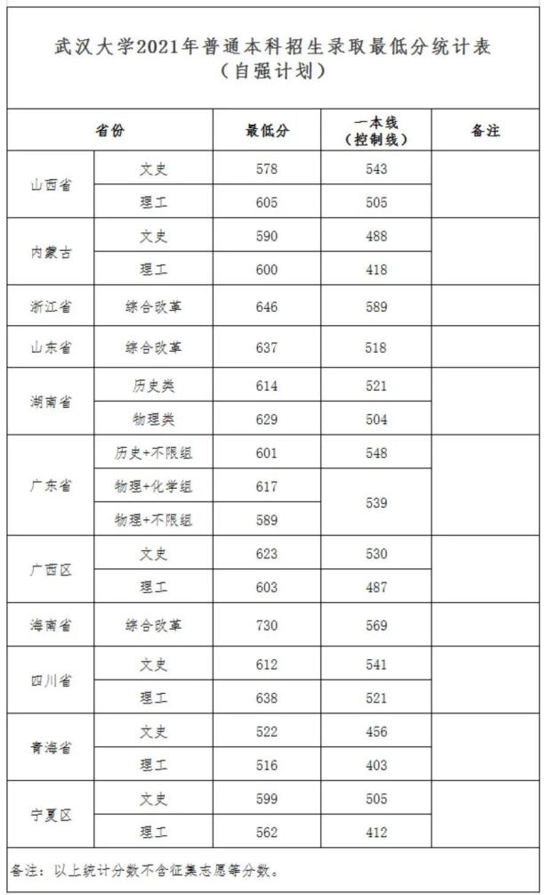 武汉大学2021年普通本科招生录取最低分统计表(自强计划)