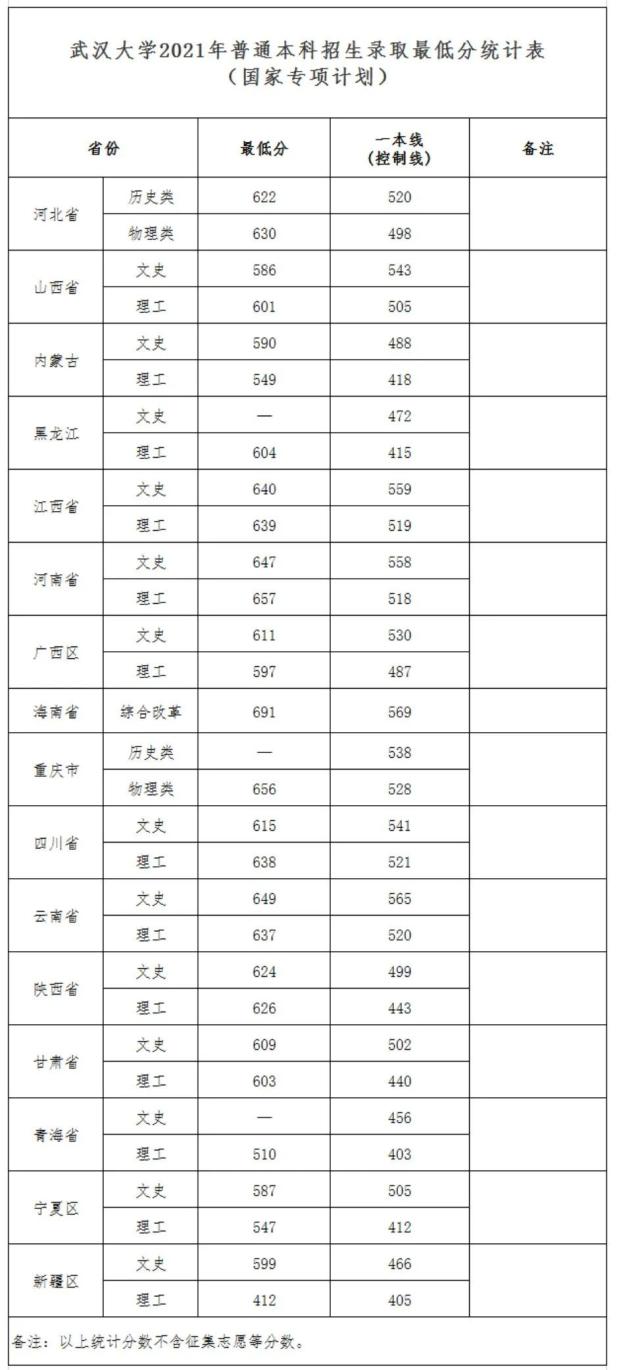 武汉大学2021年普通本科招生录取最低分统计表(国家专项计划)