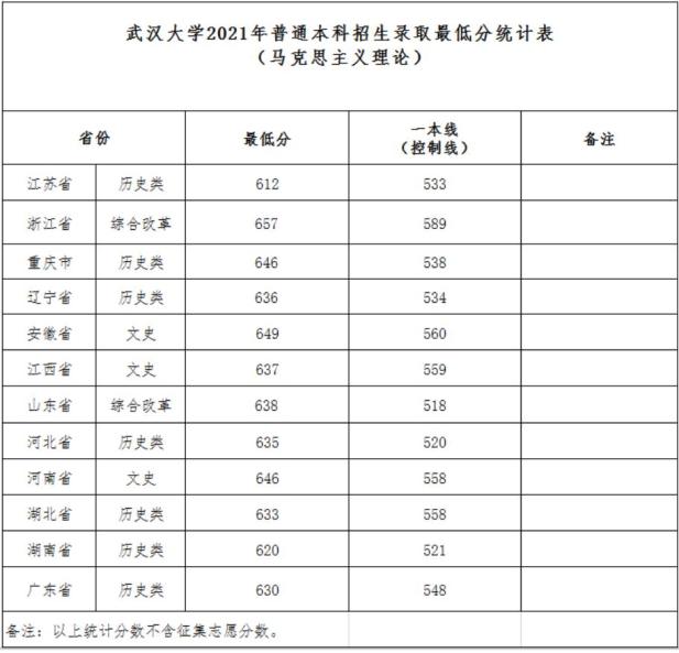 武汉大学2021年普通本科招生录取最低分统计表(马克思主义理论)