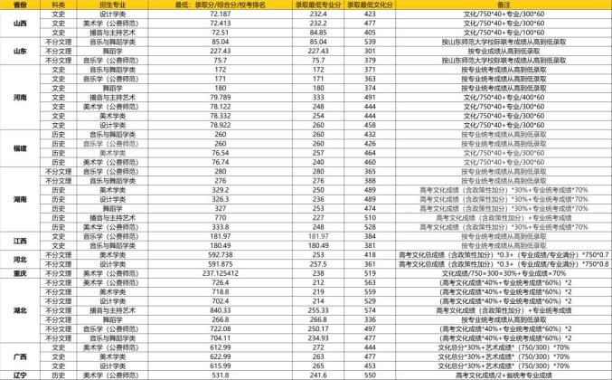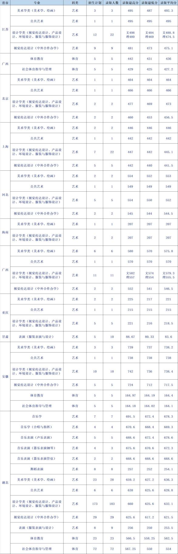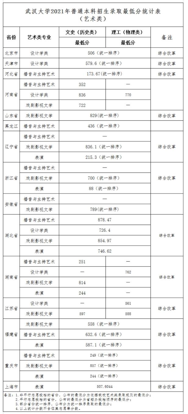 武汉大学2021年普通本科招生录取最低分统计表(艺术类)