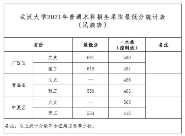武汉大学2021年普通本科招生录取最低分统计表(民族班)