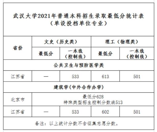 武汉大学2021年普通本科招生录取最低分统计表(单设投档单位专业)