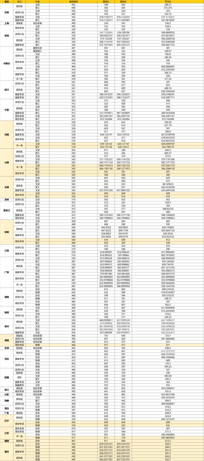 中南财经政法大学各省(市、区)高考录取分数线