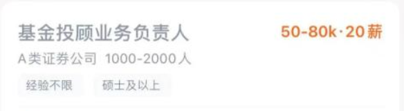 有甚者开出百万薪酬招揽贤才。某招聘网站显示,国内一家A类证券公司,拟招聘基金投顾业务负责人,月薪开出50K-80K(千元)、20薪,粗略估计年薪将超过百万元。