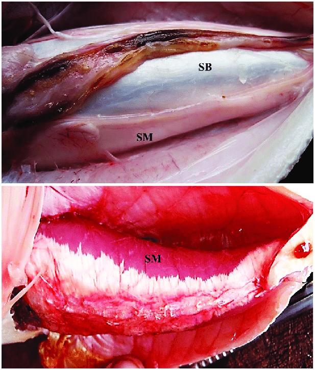 附着在巴西异鳞石首鱼(Plagioscion squamosissimus)鱼鳔(SB)上的音肌(SM),请不要对这个缩写做什么联想 | Alfredo Borie et al. / PLoS ONE (2014)第二种,骨骼摩擦,原理与蟋蟀摩擦前翅发出嘘嘘声类似,这类鱼能通过摩擦两块硬骨骼(通常是鳍骨、下颚或牙齿)而产生声音。这类发声通常频率比挤压鱼鳔要高,此外鱼儿们尚能借助鱼鳔来放大自身发出的声音。