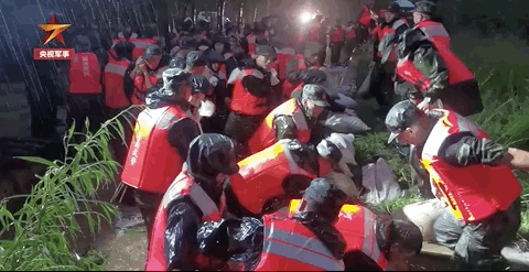 21日凌晨,驻豫空降兵某旅接令后迅速出动650人、车辆38台赶赴现场。官兵们冒雨抓紧加高护堤,筑起长1.5公里、高1.2米的沙袋墙,目前已完成大部分河堤加高任务。