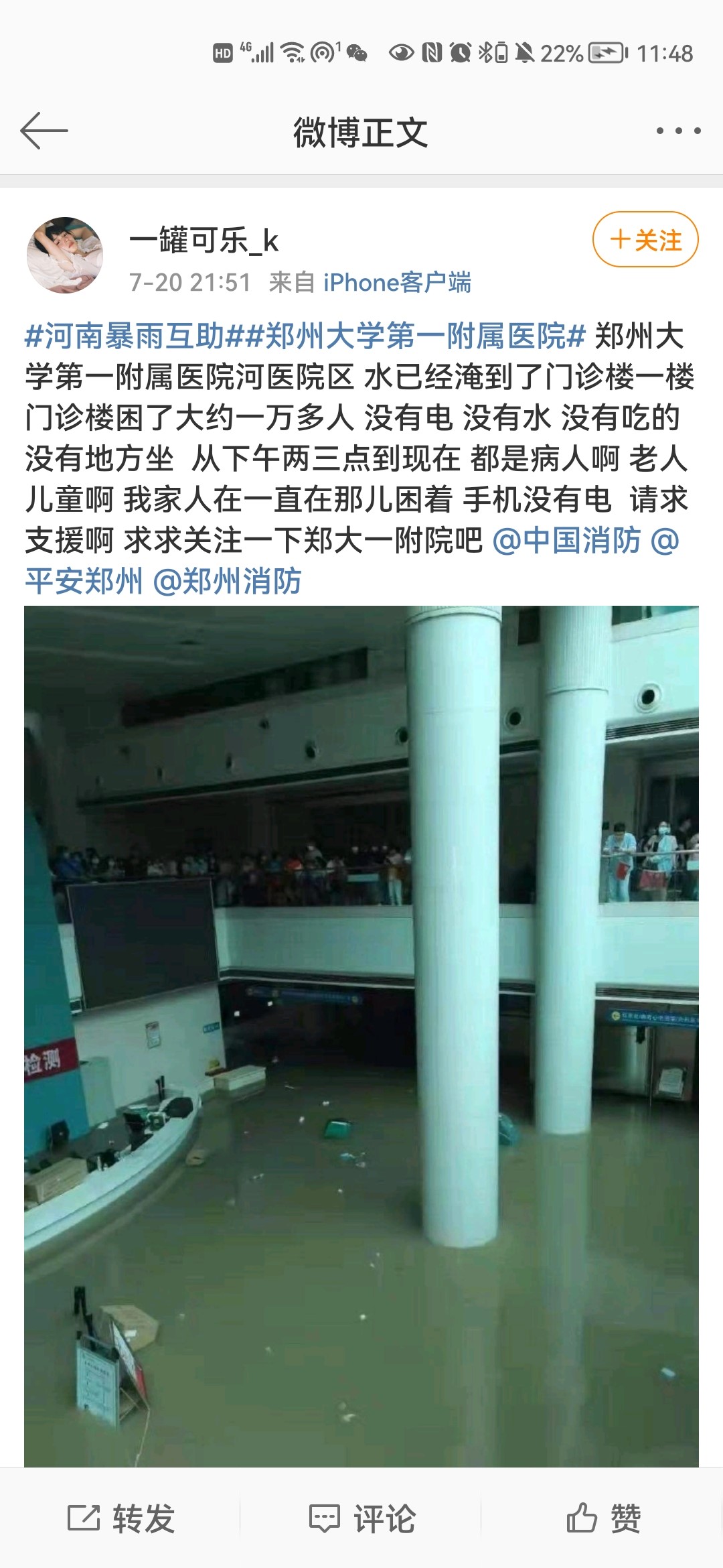20日21时46分,有网友在微博发起求救信息称,“洪水已经淹到了郑大一附院门诊楼一楼,门诊楼困了大约一万多人,没有电,没有水,没有吃的,没有地方坐,从下午两三点到现在,很多病人都是老人、儿童。”