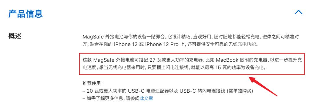 根据苹果官网介绍,在有线充电模式下,MagSafe 外接电池可以为 iPhone 提供最高 15W 的充电功率,而在无线充电模式下,它的充电功率大概在 5W 左右。