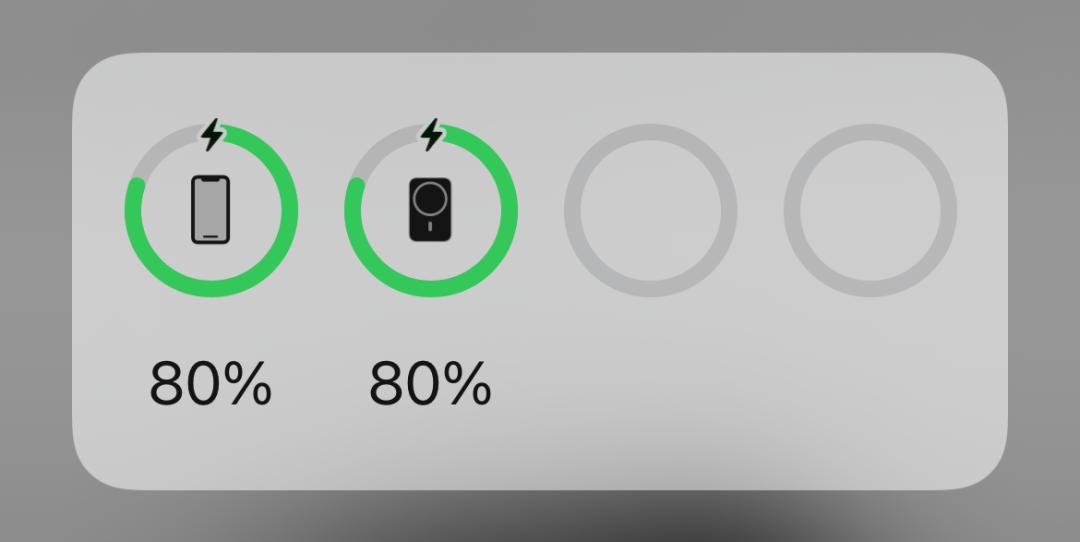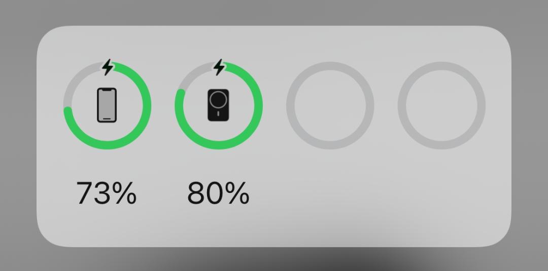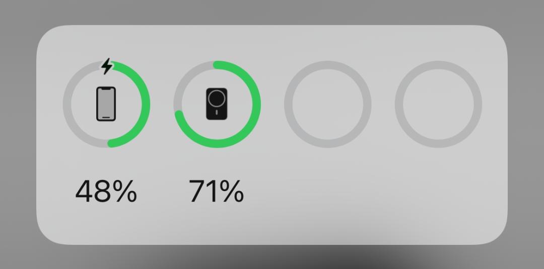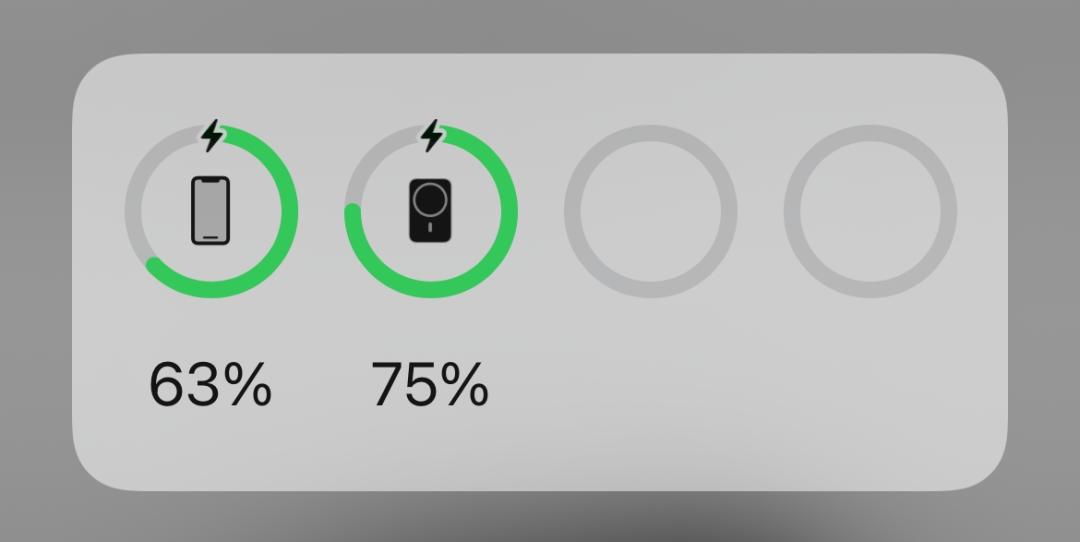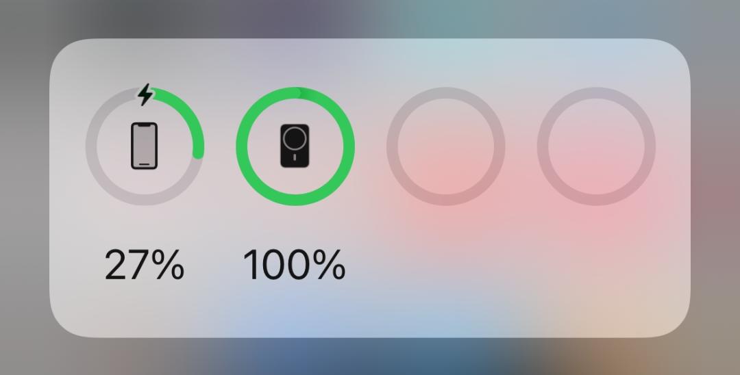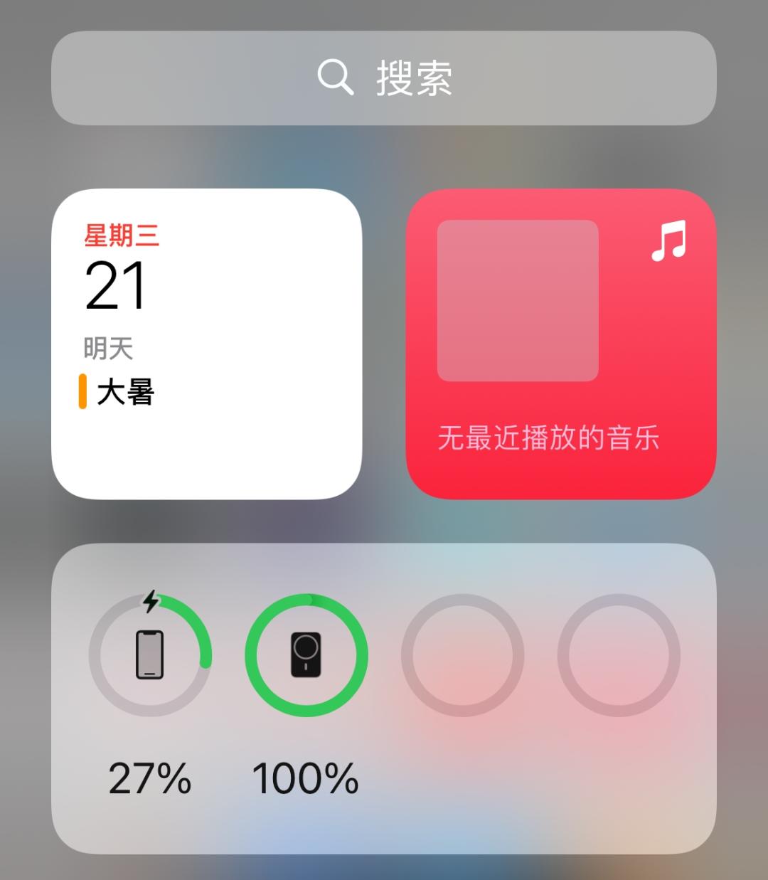 然后你就可以在小组件里看到 MagSafe 外接电池的剩余电量百分比了,第三方充电宝就做不到这点: