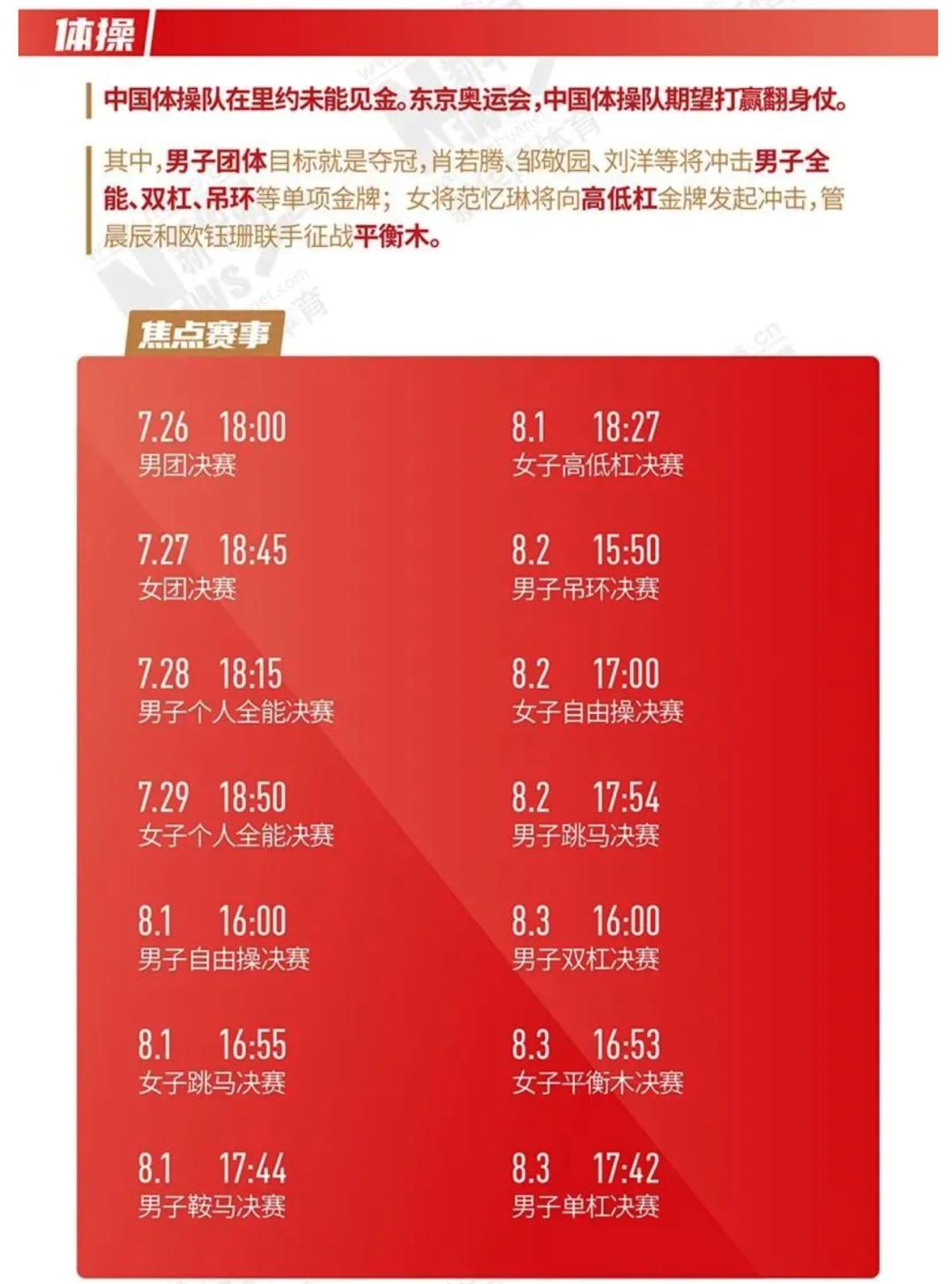今天的竞技体操依旧是看点,男子双杠、单杠和女子平衡木都是咱们夺牌的热门。