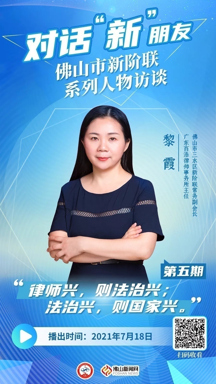 “新”朋友名片:黎霞黎霞,第十三届全国人大代表,佛山市三水区新阶联常务副会长,最高人民法院、最高人民检察院特约监督员,广东法院粤港澳大湾区跨境商事纠纷特邀调解员,广东百浩律师事务所主任,佛山市优秀律师,佛山律师行业贡献奖获得者。
