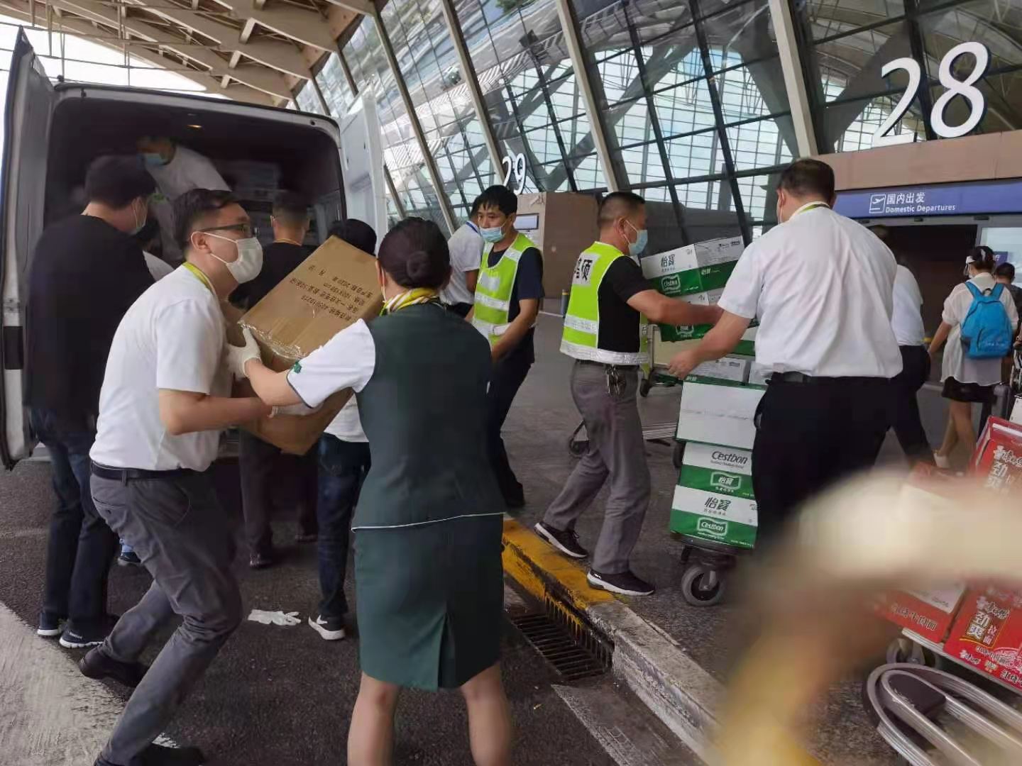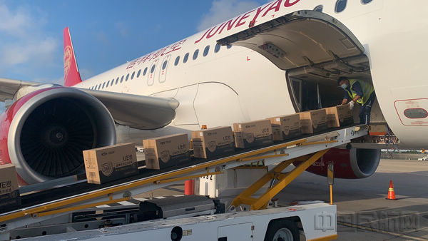 7月23日早晨,吉祥航空航班在浦东机场装运均瑶集团捐赠给河南郑州的物资。 吉祥航空 供图