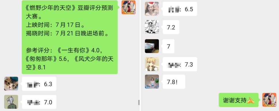 我和菠萝憋了两周都快憋便秘了,终于写完了几段关于彩虹形成原理的歌词。后来这事儿就搁脑后了。直到前两天惊闻电影上映了!我司小伙伴都很激动,决定全体观影!出发前,我特意办了场豆瓣评分预测大赛: